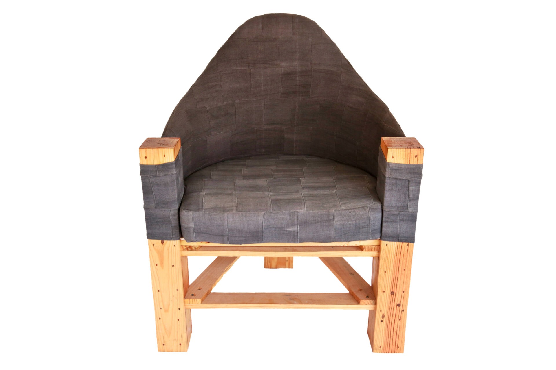 Cette chaise rembourrée en palette allie robustesse du bois recyclé et douceur du tissu teint à la main.