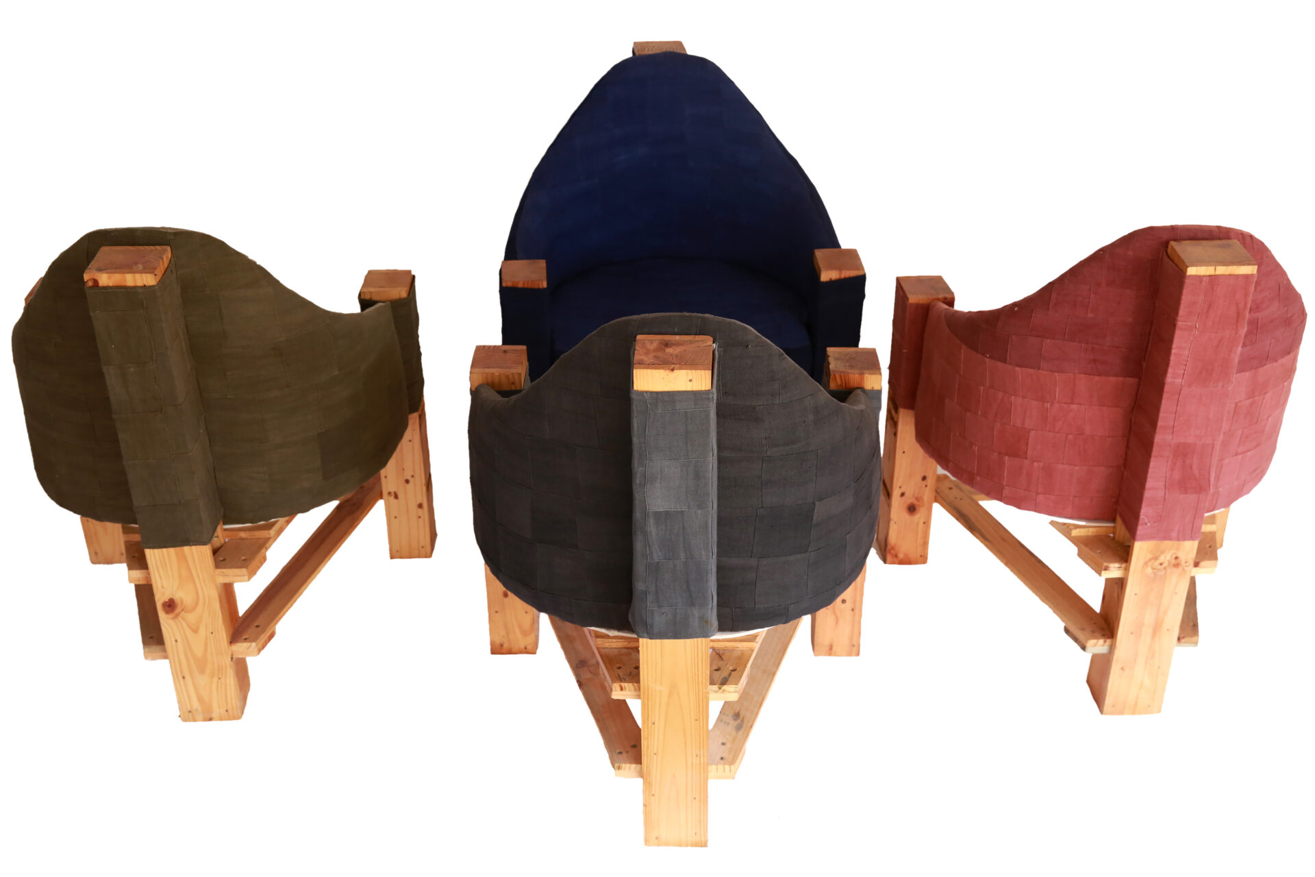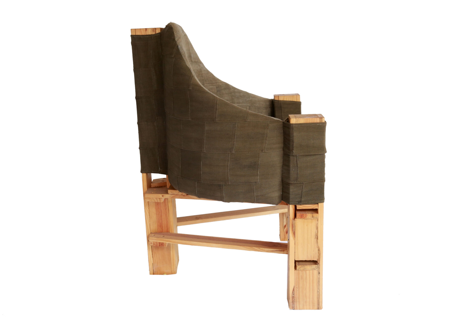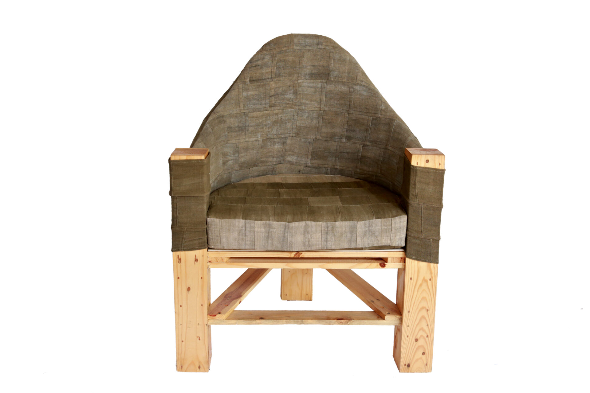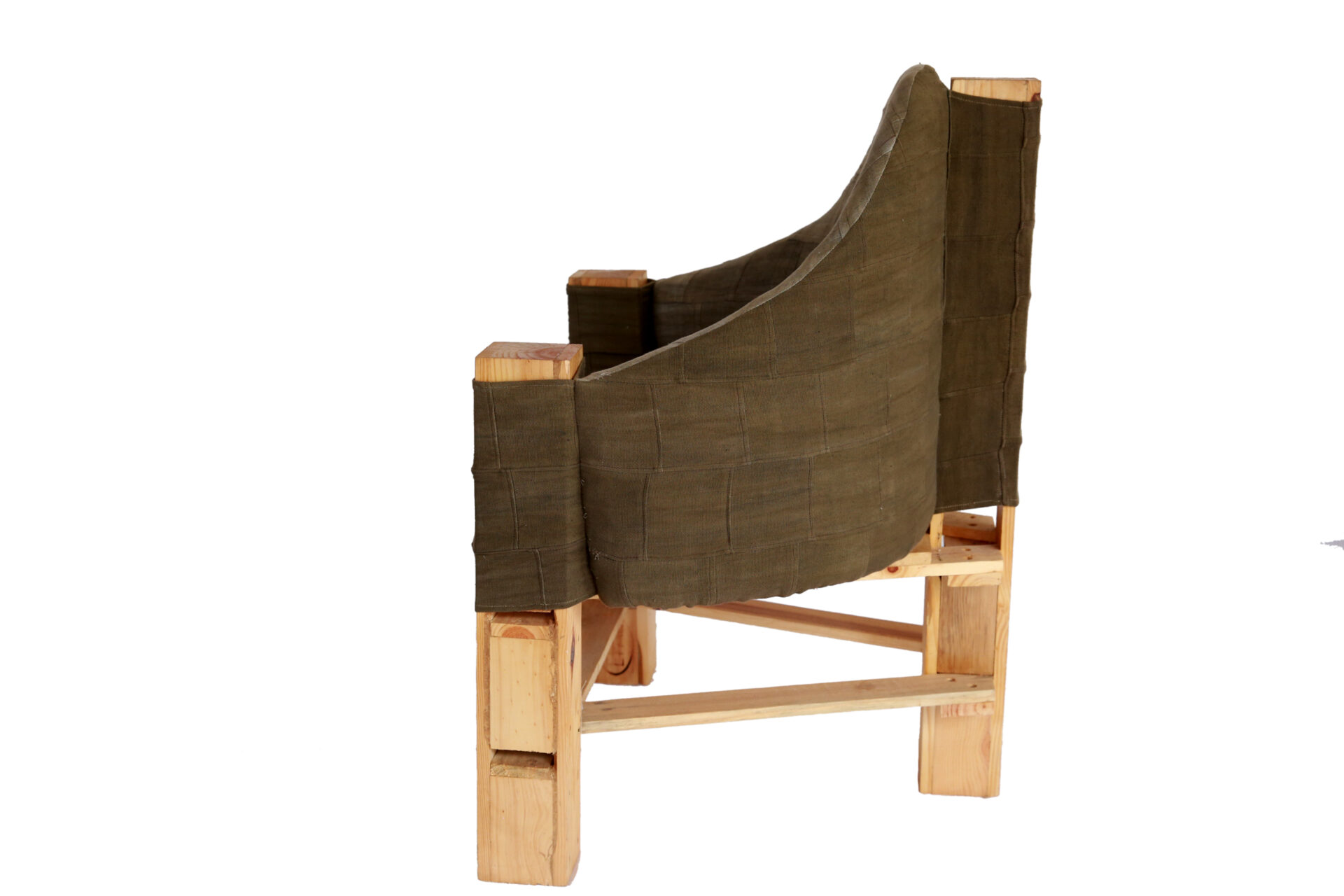 Cette chaise rembourrée en palette allie robustesse du bois recyclé et douceur du tissu teint à la main.