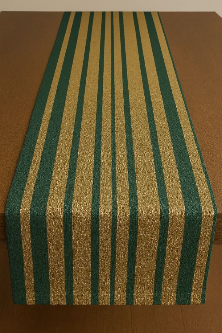 Le chemin de table Forêt Dorée apporte une touche sophistiquée à votre décoration. Ses rayures régulières en vert sapin et or profond sont tissées en 100% coton, offrant un rendu raffiné et lumineux.