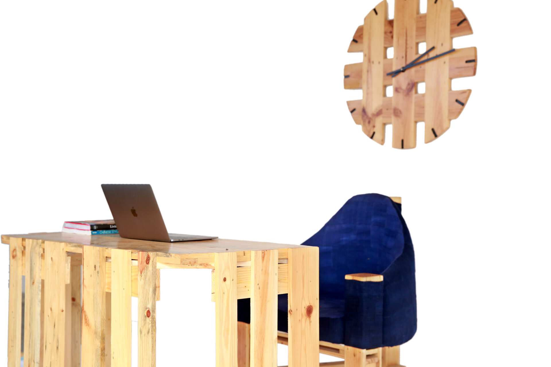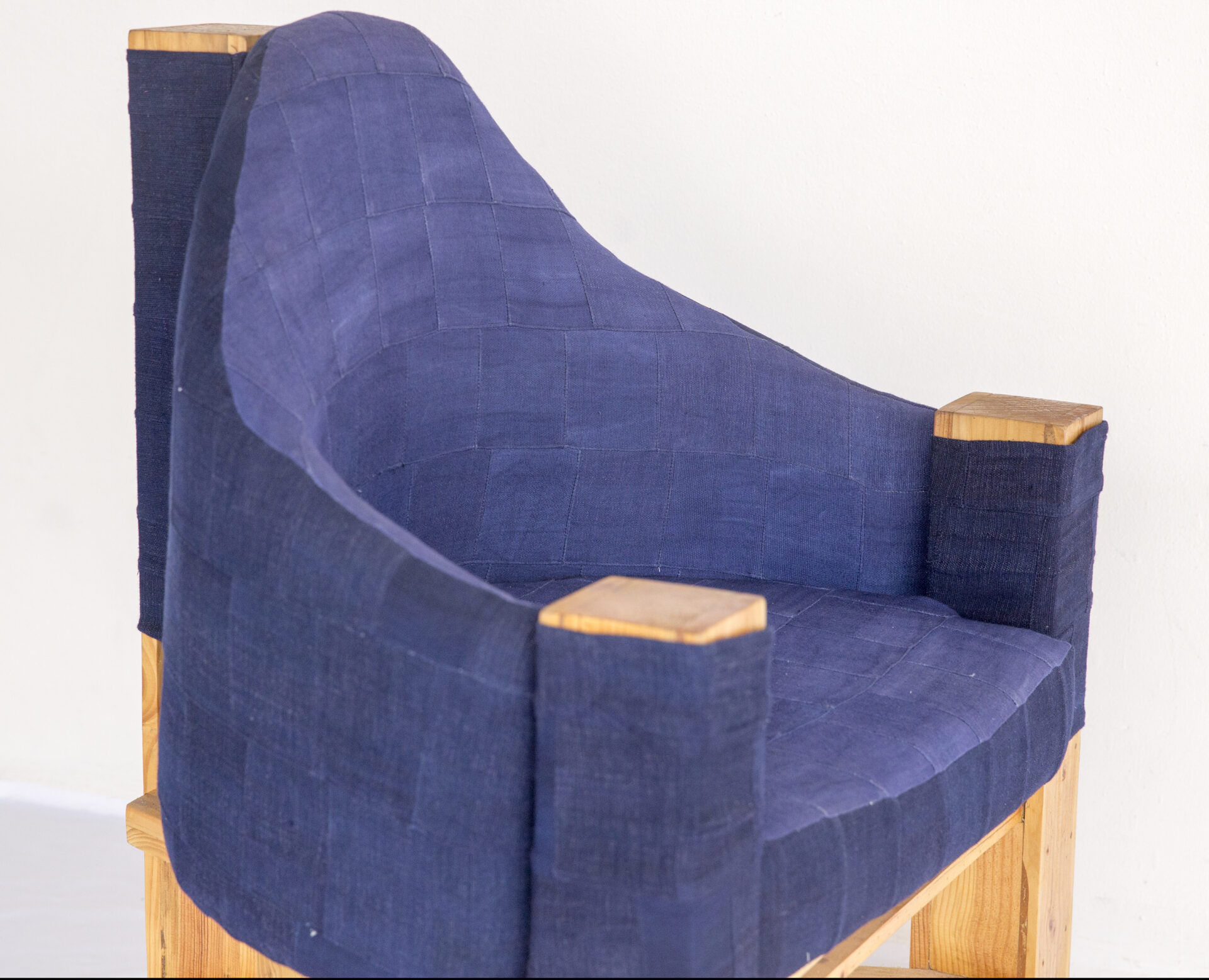 Cette chaise rembourrée en palette allie robustesse du bois recyclé et douceur du tissu teint à la main.