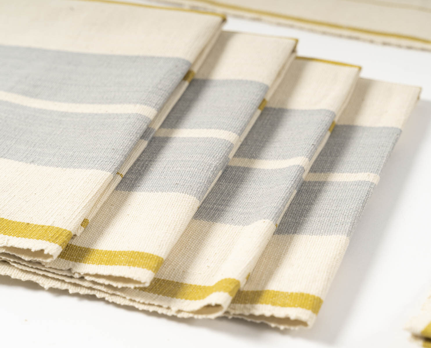 Avec ses rayures fines en gris perle et jaune moutarde, la collection Soleil d’Hiver apporte une chaleur douce, idéale en toute saison.